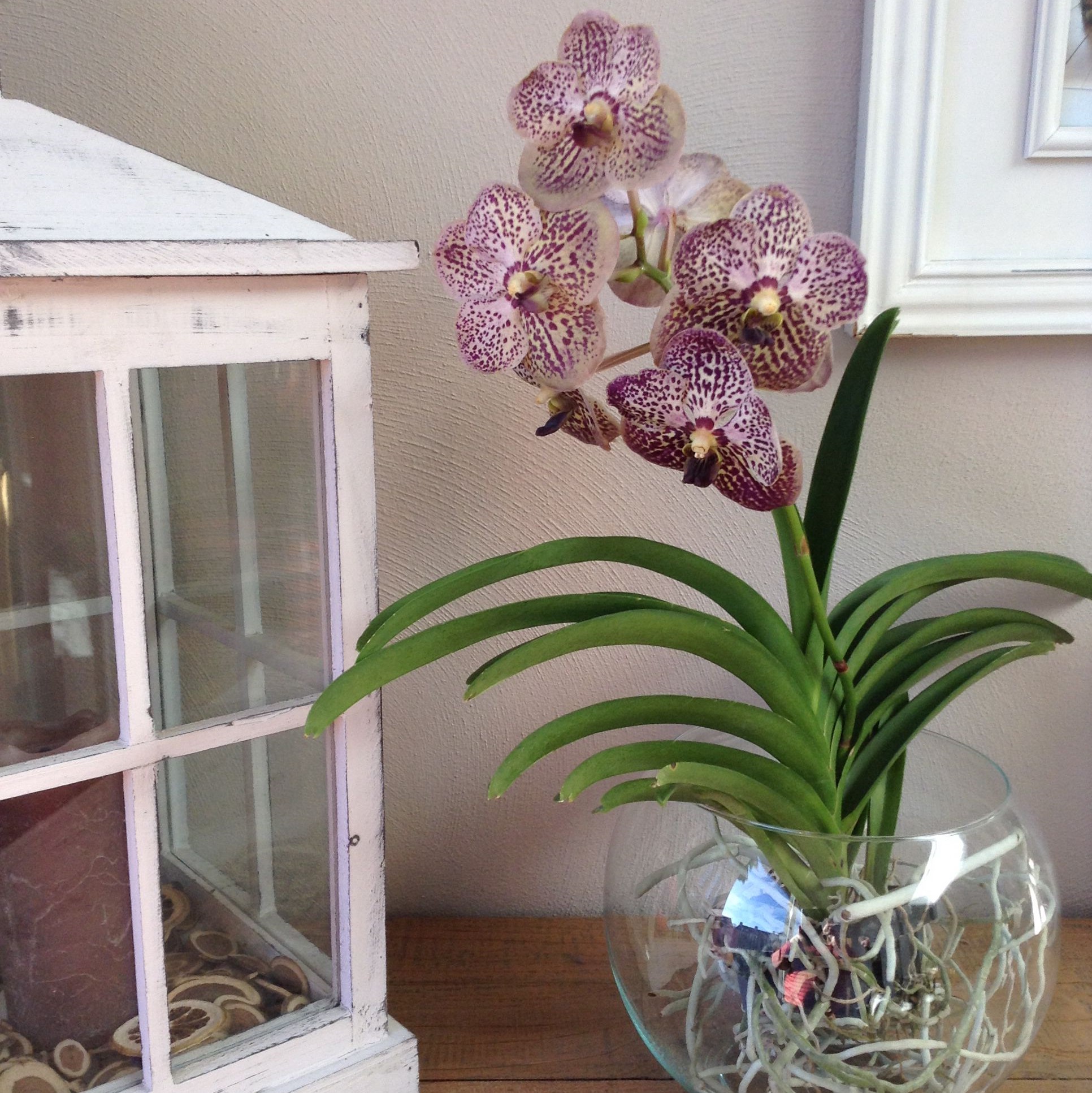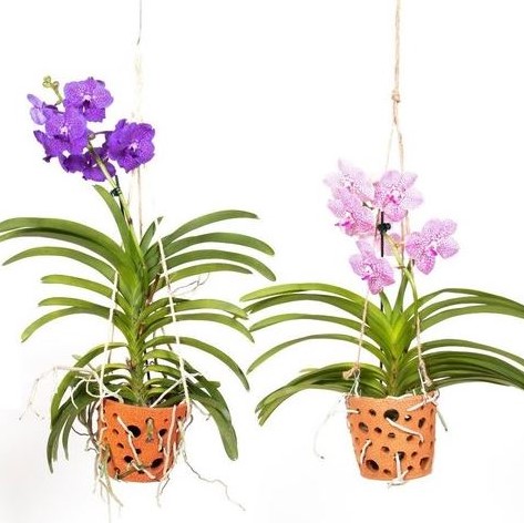 The Vanda looks great in a vase, with its decorative roots clearly visible. The roots become attached to the glass at some point. The Vanda can also be hung from the ceiling without using a root ball or potting soil! Loose on a hook or suspended from a chandelier, the Vanda steals the show. We are also increasingly seeing the Vanda in a terracotta hanging pot with holes. The Vanda's roots have plenty of room to dangle through the holes. It also looks super cute!