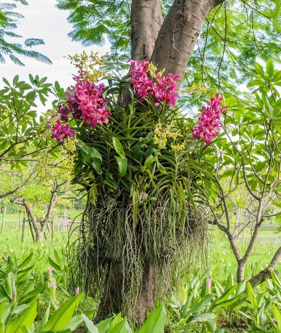 The Vanda is found growing wild in many places, from India and Sri Lanka to northern Australia. The Vanda has a unique growth habit that is not common in nature. This is because it does not grow in the soil, but on a tree. The aerial roots hang freely or wrap themselves around the tree. Because the roots act like a sponge, they can absorb all the water and nutrients that comes from morning dew and rain. So the Vanda does not need potting soil. In fact, the roots would rot in soil.
